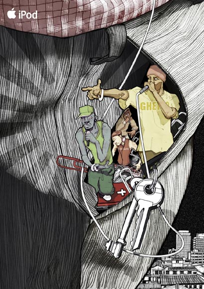 Lo realmente curioso de las ilustraciones es como se muestra la música del Ipod, es como una representación musical en miniatura de lo que estás escuchando en algún momento… Se identifica el bolsillo del pantalon de un chico, el escritorio de una oficina y el bolso de una mujer…