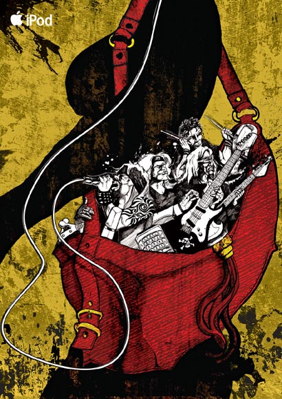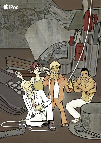 3 dibujos para anuncios del Ipod de Apple, en donde se ilustra con inteligencia (y con un estilo diferente) tres facetas musicales: Hip hop, Boy band y Rock…