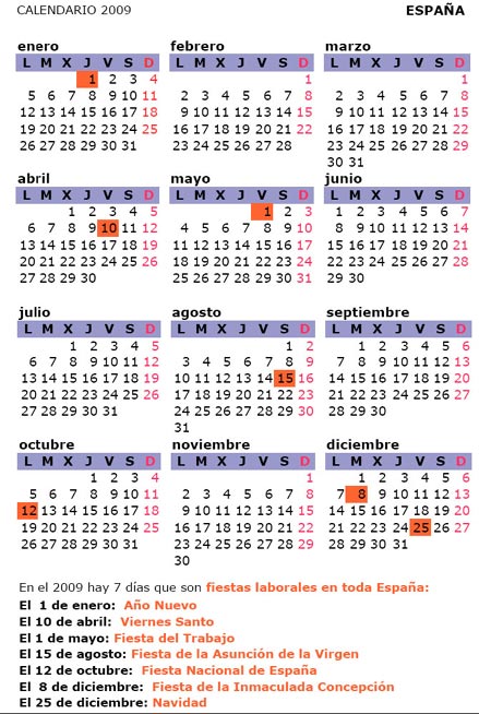 Tres opciones más para estar a tiempo en todo momento. Calendario 2009 en PDF gratis, listo para imprimir en tamaño A4. Además tiene algunas fechas conmemorativas (Días Festivos de España para el 2009) lo cual nos ayudará seguramente para saber que días del 2009 serán en los que se librará por festividades en España (espero pronto conseguir versiones de otros países).