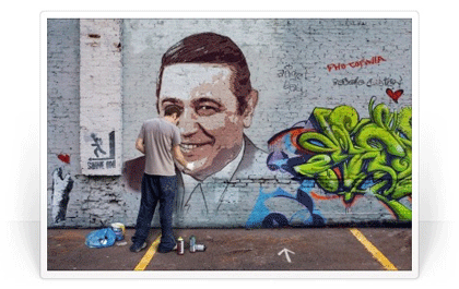 - Un hombre muy sonriente e la pared junto a un graffiti