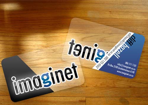 - Tarjetas de presentación de Imaginet impresas en plástico flexible con tinta negra, azul y blanca