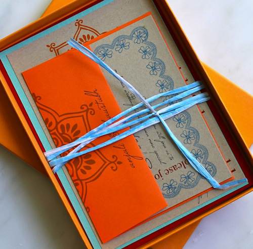 - Pequete de invitaciones de boda estilo hindu en color naranja y azul