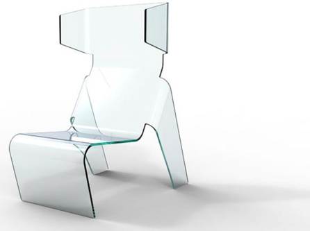 Esta es una silla monolítica de vidrio curvado totalmente transparente con un diseño visualmente geométrico.