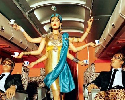 Azafata con 6 manos, como una diosa hindu